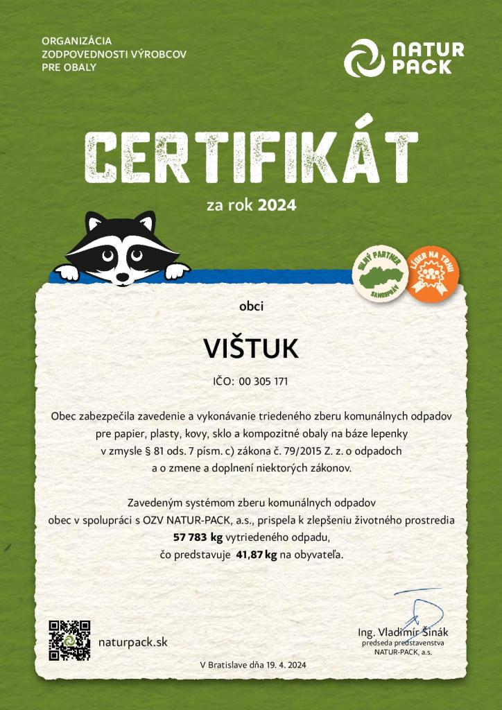Obec Vištuk zavedením a vykonávaním triedeného zberu komunálnych odpadov, prispela k zlepšeniu životného prostredia, za čo jej spoločnosť NATUR PACK a. s. udelila Certifikát.