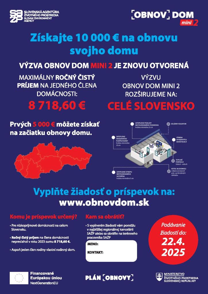 Dňa 01.04.2025 sa o 10:00 hodine v Kultúrnom dome uskutoční výjazdové stretnutie Slovenskej agentúry životného prostredia k výzve "Obnov dom mini 2", do ktorej sa môžete zapojiť.