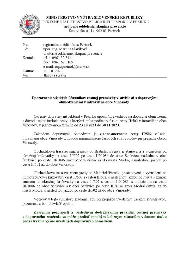 Upozornenie všetkých účastníkov cestnej premávky v súvislosti s dopravnými obmedzeniami v intraviláne obce Vinosady v termíne od 23.10.2023 do 30.11.2023.
