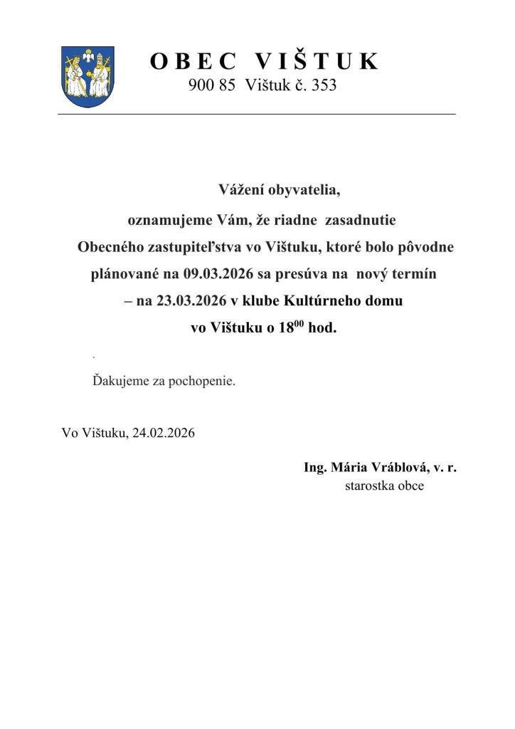 Zasadnutie, ktoré bolo pôvodne plánované na 09.03.2026, sa presúva na nový termín – 23.03.2026 v klube Kultúrneho domu vo Vištuku o 18:00 hod.